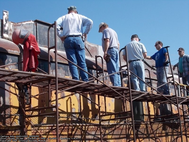 The team gathered on the scaffold to examine the early sandblasting results - Photo by Jane Pomazal - Pauline Trabert (trabert)