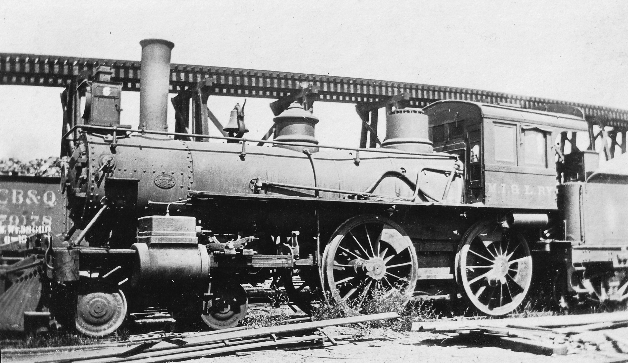 Photos of MI&L 6 are very rare. Written on the back of the print: "Macomb Industry & Littleton #6 at CB&Q roundhouse, Galesburg, Ill. Ex Vandalia VD2, Pittsburgh 1-84 #695. Ex-Vand. (StL Vand. & Terre H) #182, 4-4-0, 17x24, 66"." This engine was built for the St. Louis Vandalia & Terre Haute (the builder's plate in this photo, when zoomed in, does appear to read "V-D.2" so it may have been class D.2) as their #182. In 1899, it became Terre Haute & Logansport #302, and in 1905 it became Vandalia Railroad #302. The Pennsylvania Railroad classified it as a D-22. The MI&L purchased it in March 1915.